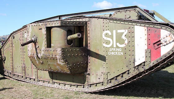These replica tanks looked very authentic and were fully powered. The Mark Vs were built out of wood at Weta Studios, and are based on a bulldozer.