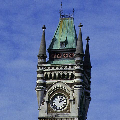 More Photos of the University (Up to OJB's Dunedin Photos Page) Otago University ClocktowerThe clocktower in the old Otago University building which now houses the bureaucrats who "run" the University. The University has about 19,000 students and 2000-3000 staff. The buildings are a mixture of older stone buildings like this one, small old converted houses and some rather ugly modern concrete towers. Photographs of the Otago University clocktower are a bit of a cliche but it is still a nice subject with interesting colours and textures from the green oxidised copper roof to the worn rock. This image is from a Fuji 100 slide.