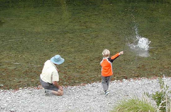 (Up to OJB's Nelson Photos Page) Throwing StonesWhen you find a peaceful stream in a quiet valley somewhere its pretty important to do a few basic things, such as cross to the other side (especially if its fairly fast flowing) and throw a few stones in (and make the flat ones skip). Here's Phillip and his grand-dad doing the stone throwing. Green is the dominant color here (even the stream has a green tint) so the bright orange contrast of Phillip's top is particularly jarring. I guess that was kind of symbolic of how the noise and stone throwing broke the peace of the place. Or am I reading too much into this? Yes, I think so!